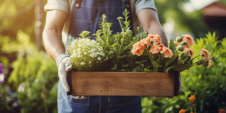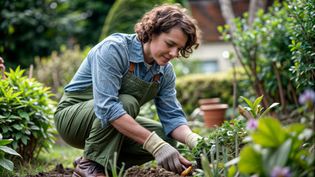 Gardener in protective gear working with vibrant flowers in a well-maintained garden. Concept of gardening, horticulture, nature care, and outdoor activity
