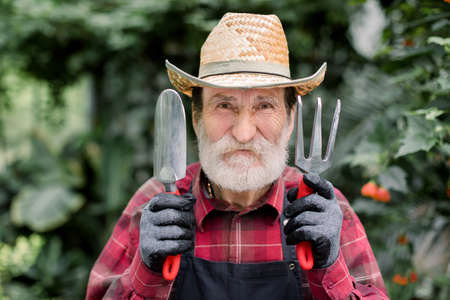 Gardening senior man portrait. Close up portrait of cheerful smiling bearded man, hothouse worker, in straw hat, red checkered shirt, holding in hands gardening tools rake and spade.