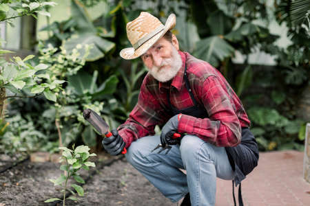 Portrait of cheerful Caucasian bearded elderly man in garden working with shovel and rake and smiling to camera. Happy retired male nursery worker in hat planting tree in greenhouse.