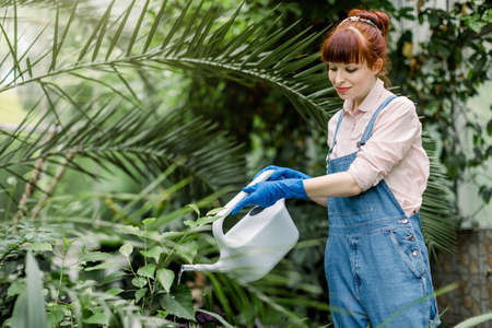 Smiling young female gardener watering the flowers. Happy florist watering plants in a greenhouse. Gardener watering plants in a greenhouse. Woman watering plants at community garden.
