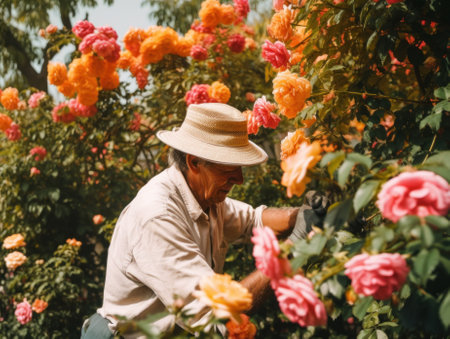 A gardener in a hat is trimming or pruning a rose bush. AI generative image.