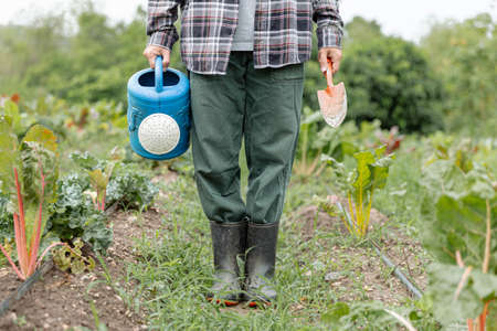 Female gardener concept a gardener holding the blue watering can and metal shovel standing among evergreen vegetable field with a variety of plants.