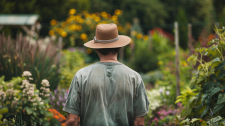 Gardening, with soil-stained hands and a sun hat, tends to his garden plants..