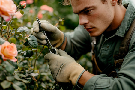 Focused gardener uses pruning shears to trim rose bushes, ensuring the plants thrive in the lush greenhouse. The atmosphere is peaceful, filled with the scent of blooming flowers.