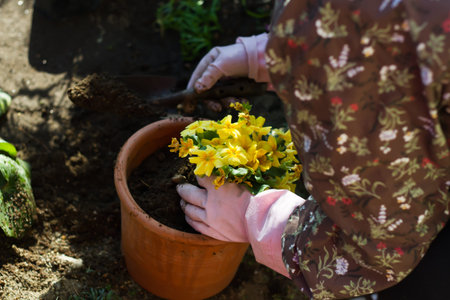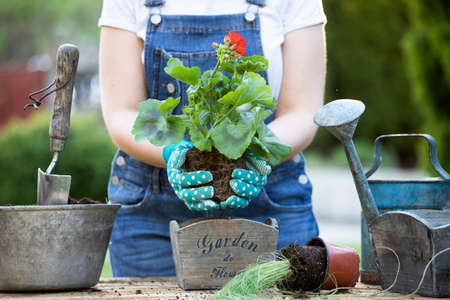Woman gardener transplanting flowers in pot. Concept of home garden, spring activities..