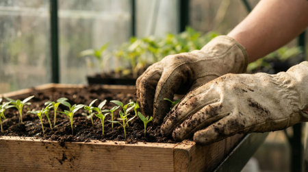 Gardner hands wearing dirty gloves carefully planting small green seedlings in rich dark soil inside a wooden planter within a warm greenhouse, nurturing new life and growth