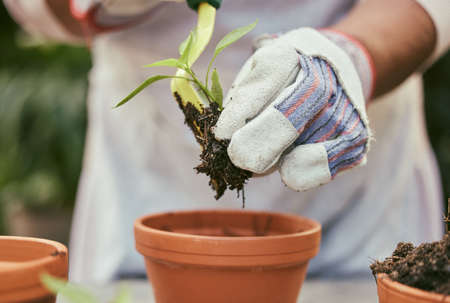 Cropped image of a female gardener in gloves working with seedlings