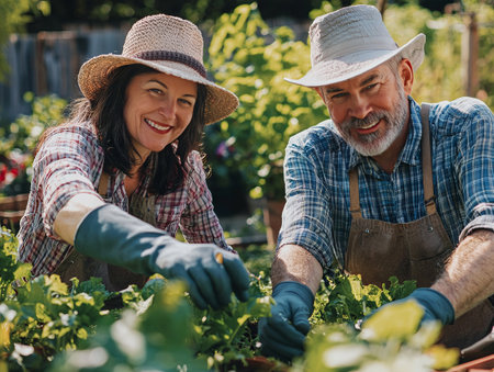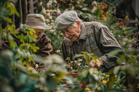 Elderly Man and Woman in Garden Hats Tending to Plants in a Sunlit Garden AI