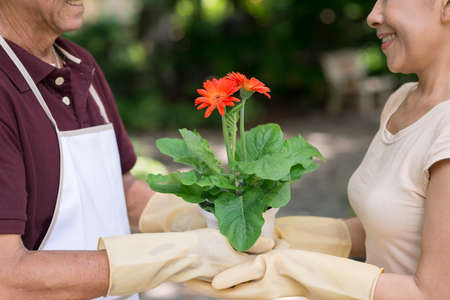 Close-up image of a senior couple holding a flowerpot with a blooming flower together
