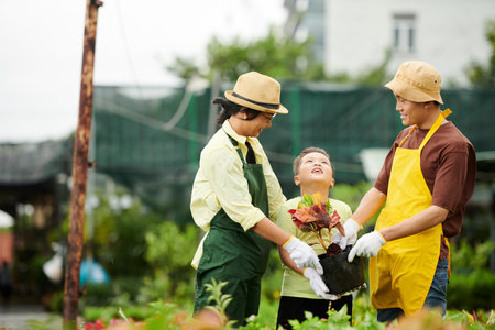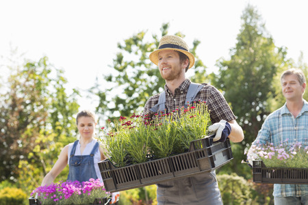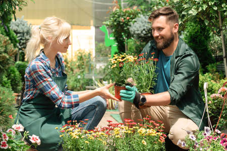 Happy multiracial gardeners having fun working in plants and flowers garden shop