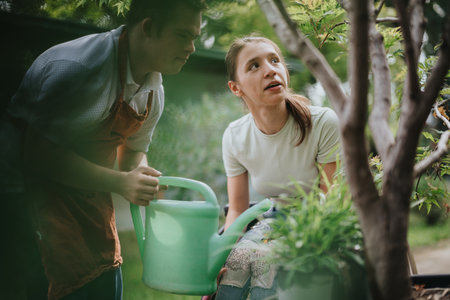 Two enthusiastic gardeners are joyfully tending to their vegetable garden, surrounded by vibrant greenery and blooming flowers, showcasing teamwork and connection with nature
