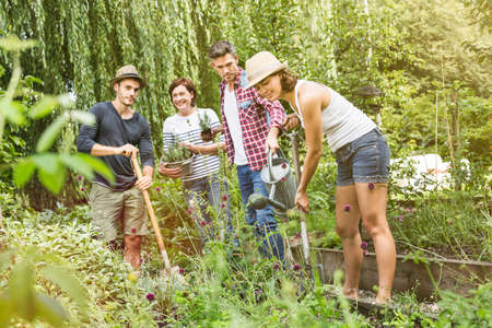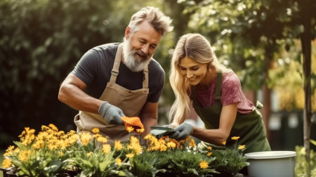 Stock photo of old man and adult woman cultivating plants in the garden during sunny day. Gardening concept.