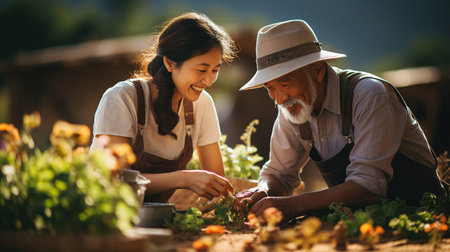 A happy senior Asian man and a young Black woman work together planting marigolds in a garden. They are smiling and enjoying their time together, showcasing intergenerational connection and teamwork in gardening.