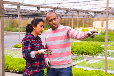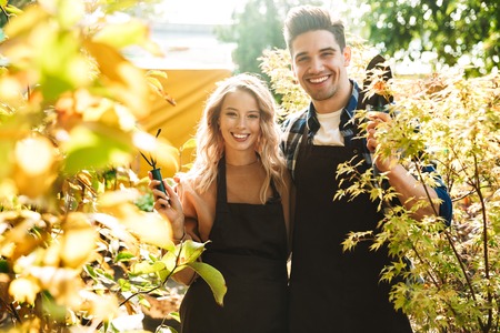 Image of a happy young two colleagues gardeners at the workspace over plants.