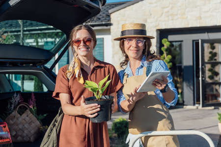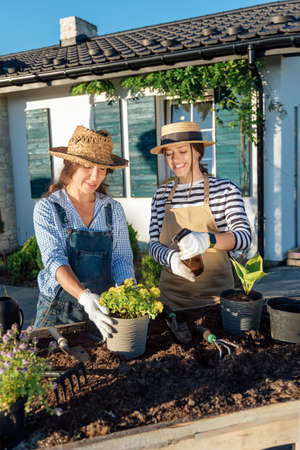 Beatiful three Woman Gardeners family are growing flowers in pots.