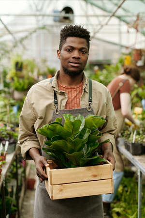 Portrait of African florist man holding green plant in box and looking at camera, he working in flower shop
