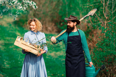 Attractive couple work near greenhouse. Man gardener in apron collect garbage in garden while his wife talking him holding box with flowers