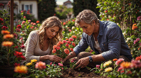 A happy couple enjoys gardening together in a lush backyard. The woman uses pruning shears on a red rose bush while the man holds a watering can, both laughing and enjoying the outdoor activity.
