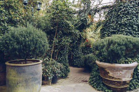 shrubs in flower pots and green and climbing plants inside of greenhouse