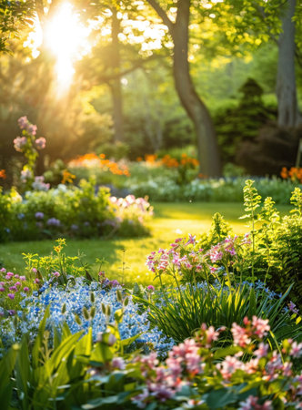 delightful garden setting with the sun shining through colorful blooms and delicate details, created with generative ai