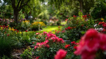 Enchanting garden vista featuring colorful roses amidst lush greenery and stone pathway.