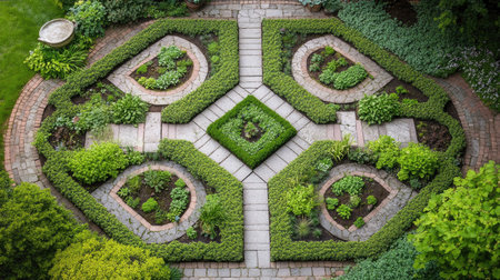 Explore an aerial view of a beautifully designed geometric garden featuring intricate patterns, lush greenery, and serene pathways, perfect for nature lovers.