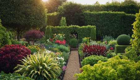 This image showcases a stunning garden bursting with vibrant flowers and manicured hedges, offering a serene environment perfect for relaxation and appreciation of nature.