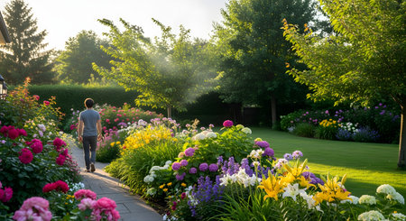 A man walks along a stone pathway through a vibrant and lush garden filled with blooming hydrangeas, lilies, and roses. The scene is illuminated by soft sunlight, highlighting the rich colors and greenery of the well-tended landscape.