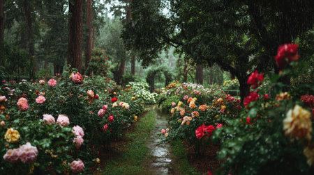 A panoramic wide view of Rose garden growing closely together under light drizzle soft raindrops on leaves ultra realistic photography natural daylight cinematic wide composition lifelike natural scene