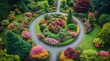 An enchanting aerial view of a winding garden pathway, bordered by vibrant flowers and lush greenery, creating a serene and inviting atmosphere in nature.
