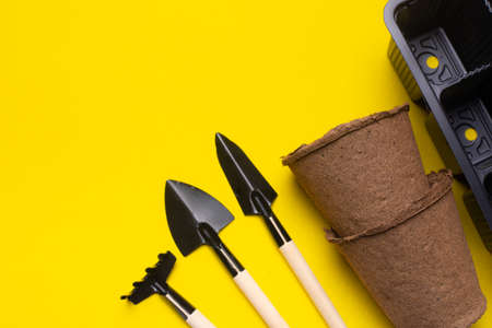 Garden tools and empty flower pots on the yellow flat lay background. Planting abstract background.