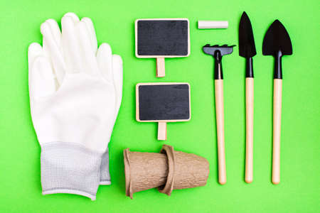 Home gardening. Miniature gardening tools: scoop, rake, inscription board, gloves and chalk on green cardboard. Top view.