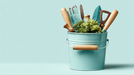 A teal bucket filled with various gardening tools and succulent plants creates a charming display in a pastel-colored indoor setting, inspiring creativity.