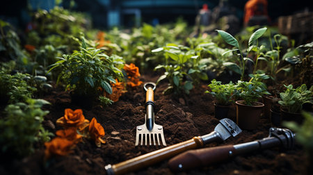 Garden tools and flower pots in the garden.