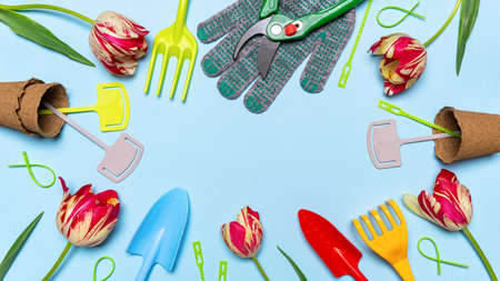 Fresh tulips flowers, multi-colored garden tools, garden signs and gloves on blue pastel background. Creative composition, springtime. Gardening, spring work concept. Flat lay, top view, copy space.