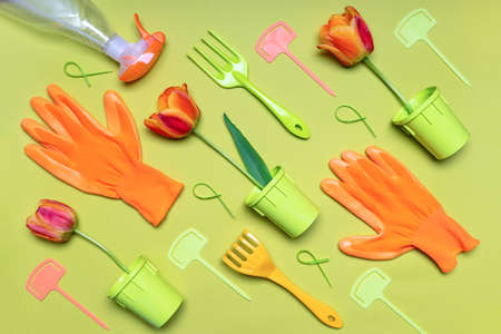 Fresh tulip flower in seedling pot, garden tools and gloves on light pastel background. Creative composition in orange and green colors. Gardening, spring work concept. Flat lay, top view.