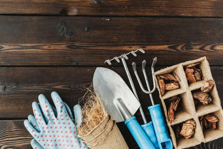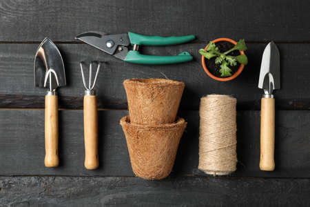 gardening tools on dark wooden background with space for text top view