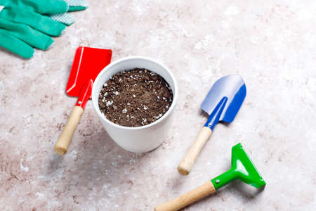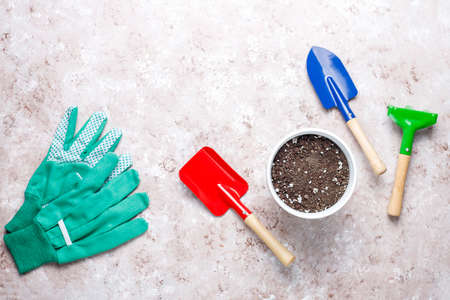Garden tools. Gardening tools on concrete background flat lay. Plant flowers for garden. Tools spade, fork, hand cultivator, hoe and pot with soil