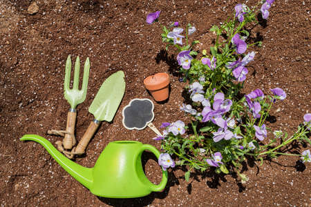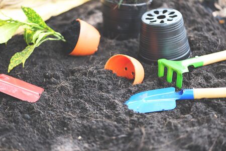 Gardening tools on soil background ready to planting flowers and small plant in the spring garden works concept gardening flower pots in sunny at back yard