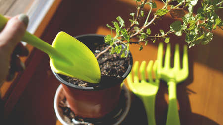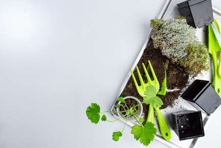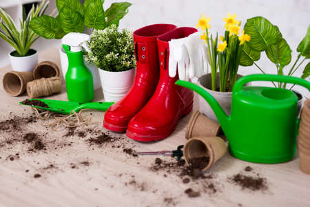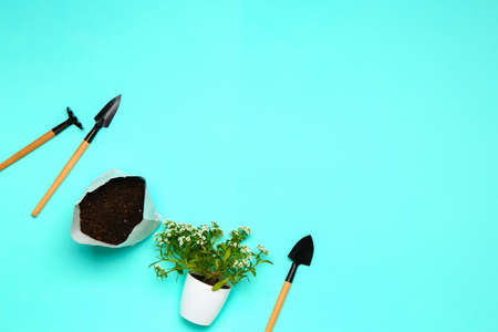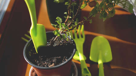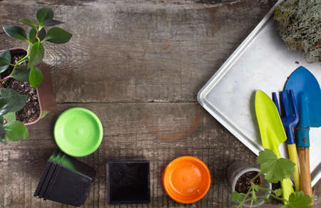 table with tools for transplanting home plants. Plant care and maintenance. Hobby.