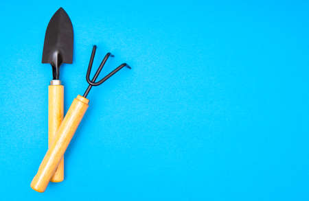 blue garden tools on the ground top view