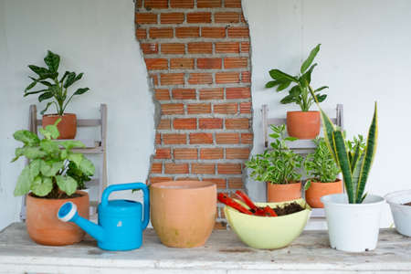 Planting flower garden. Pot plants forming a beautiful composition flower on the windowsill