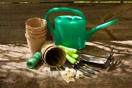 spring background - close up of gardening tools and plants on wooden table background