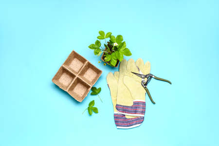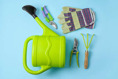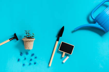 Garden tools, sprouts in a pot and a watering can on a blue background. Home gardening and plant care concept