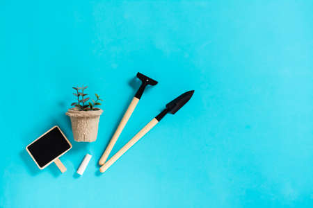 Potted sprouts, gardening tools and a writing board on a blue background. Home gardening and plant care concept