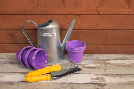 Purple plastic flower pots, watering can and yellow gardening tools on aged wooden table. View with copy space.