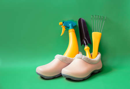 Pink rubber galoshes and yellow gardening tools on green background with copy space.