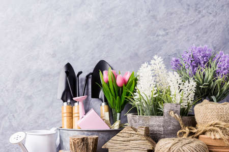 Gardening concept- gardening tools and flowers in the garden