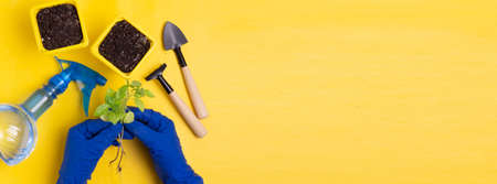 Garden water sprinkler in the gardener hand, flower pots and gardening tools on the yellow flat lay background. with a copy space. Gardening concept.