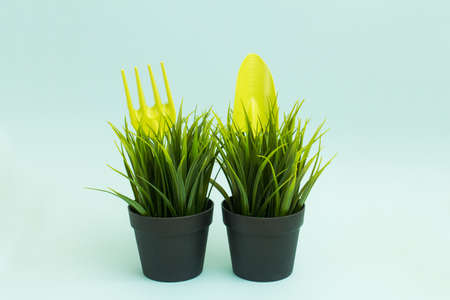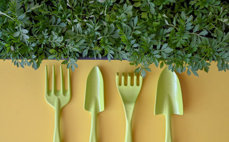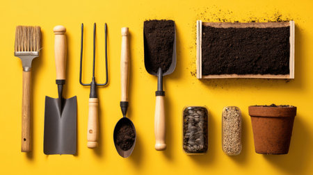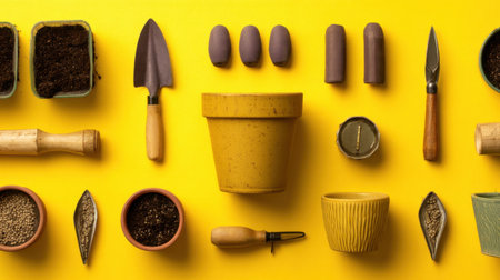 Colorful arrangement of gardening tools such as trowels, forks, and soil pots on a vibrant yellow background, ideal for gardening enthusiasts and planting projects.
